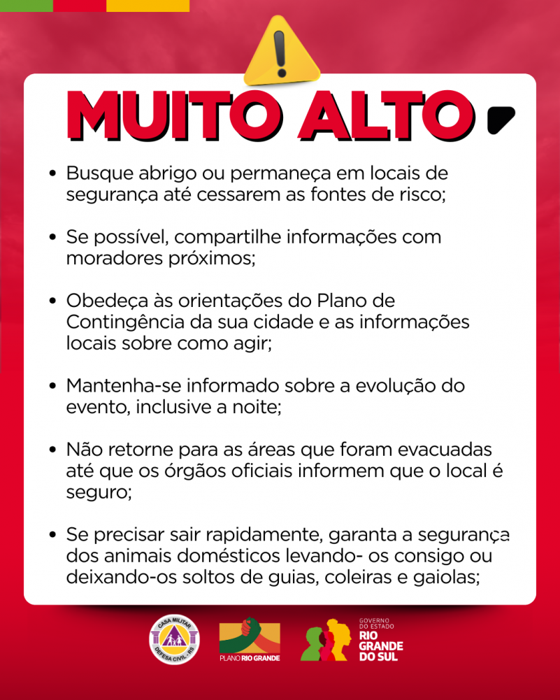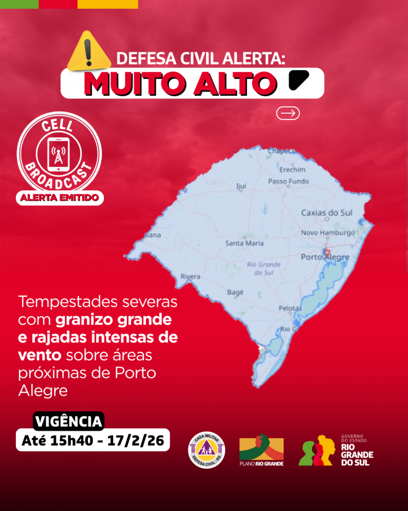 Defesa Civil alerta: condição SEVERA para tempestades severas com granizo grande e rajadas intensas de vento sobre áreas próximas de Porto Alegre. BUSQUE ABRIGO longe de árvores, placas e postes de energia. Válido até 15h40 do dia 17 de fevereiro. Evite áreas de risco. Emergência ligue 190/193.