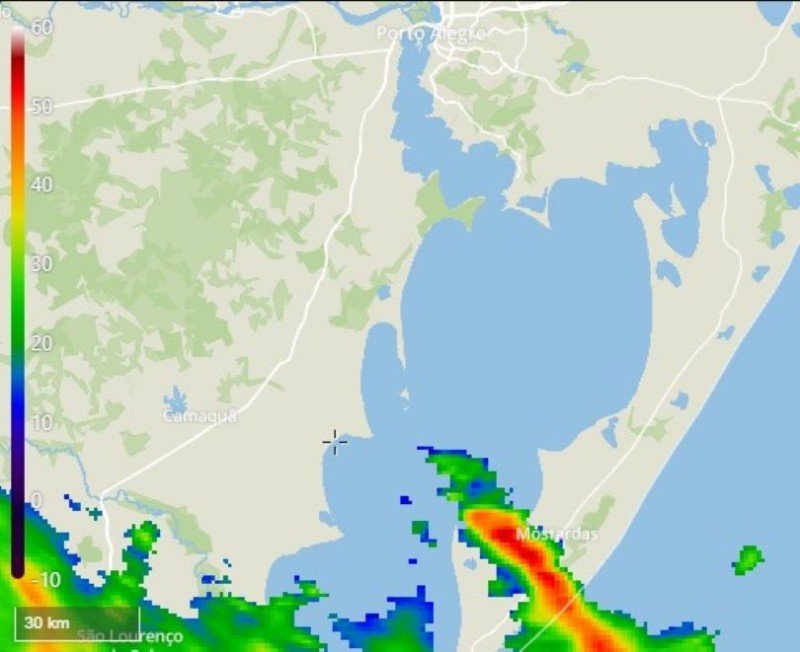 00:20 - Atualização do monitoramento do radar meteorológico do Estado: Instabilidade associada a chuva e vento fortes, com descargas elétricas e queda de granizo atua em áreas próximas de Mostardas.