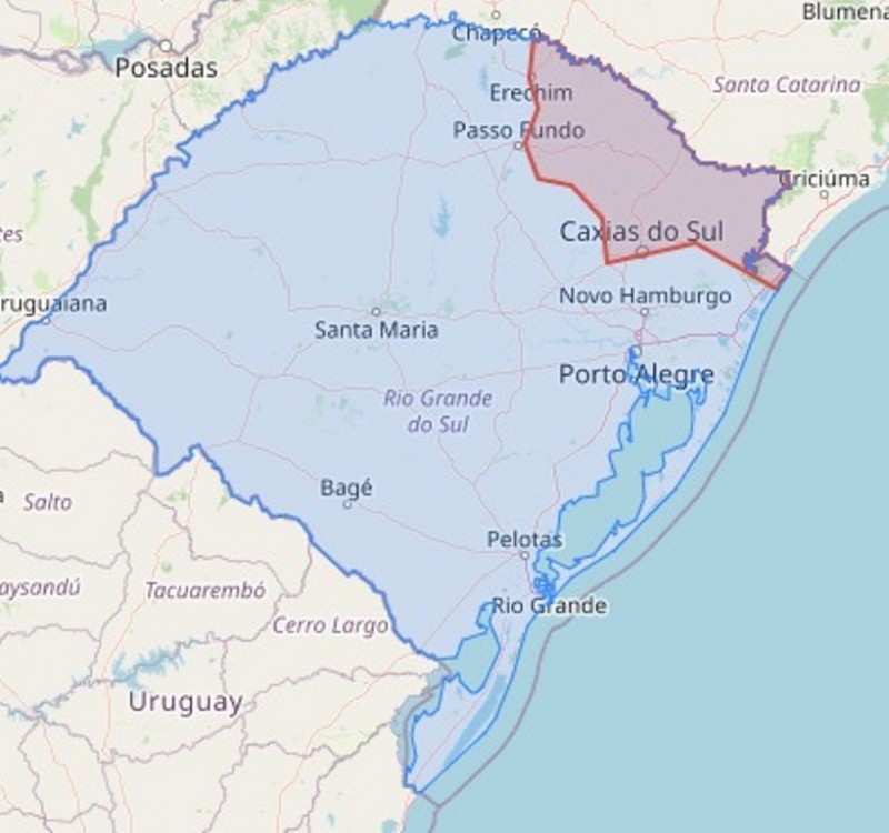 Na segunda-feira (24/1), a Defesa Civil Estadual emitiu um alerta de chuva forte acompanhada de descargas elétricas, ventos de até 80 km/h e eventual queda de granizo para as regiões delimitadas em vermelho no mapa.