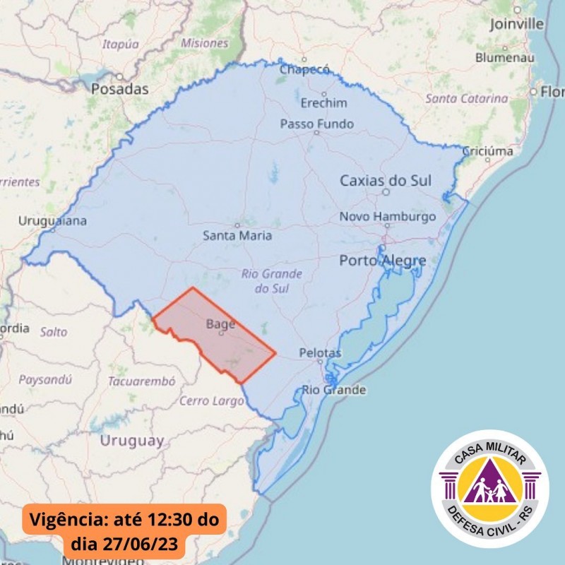 Alerta de chuva forte acompanhada de descargas elétricas, ventos de até 70 km/h e eventual queda de granizo, nas áreas em vermelho do mapa. Emergência ligue 190/193.