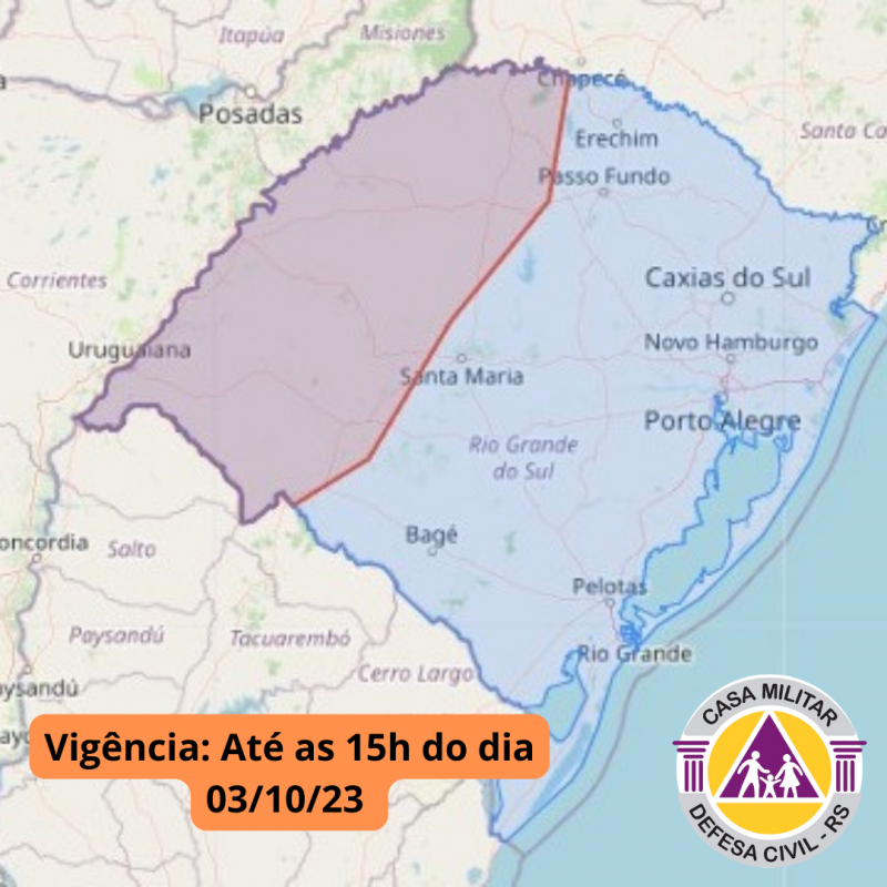 Alerta de chuva pontualmente forte, descargas elétricas, eventual queda de granizo e vento forte. Vál até 15h desta terça. Emerg. Ligue 190/193.