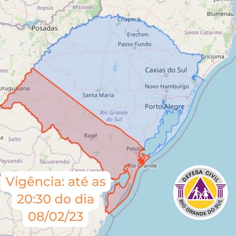 Alerta de chuva forte acompanhada de descargas elétricas, ventos de até 80 km/h e eventual queda de granizo nas áreas em vermelho do mapa. Alerta válido até as 20:30 do dia 08/02/23