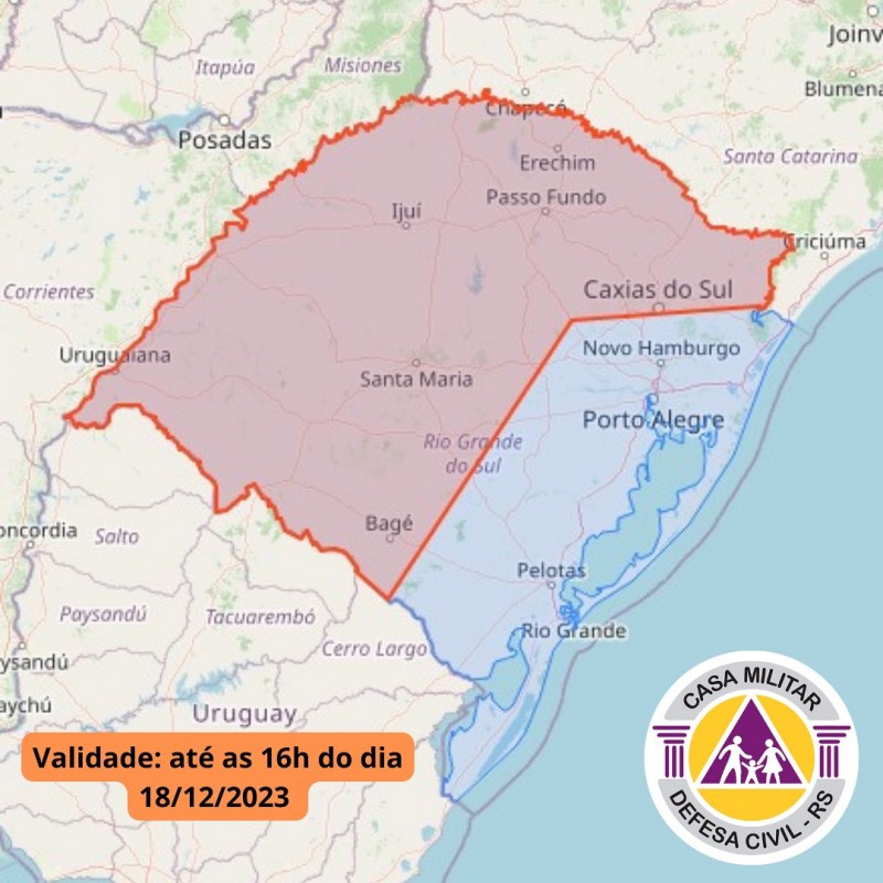 Alerta para chuvas fortes, descargas elétricas, eventual queda de granizo e ventos acima de 80 km/h.Válido até 10h da segunda. Emergência ligue 190/193.