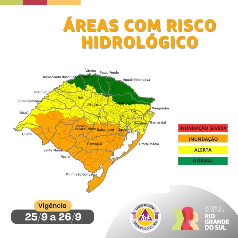 Devido à previsão de chuvas volumosas nos dias 25 e 26 de setembro, é indicado o grau de ALERTA (cidades em amarelo no mapa hidrológico) para boa parte das bacias hidrográficas do estado, sendo elas: Turvo-Santa Rosa-Santo Cristo, Ijuí, Piratinim, Butuí-Icamaquã, Ibicuí, Alto Jacuí, Pardo, Taquari-Antas, Caí, Sinos, Gravataí, Guaíba, Camaquã, Mirim-São Gonçalo, Tramandaí e Mampituba.