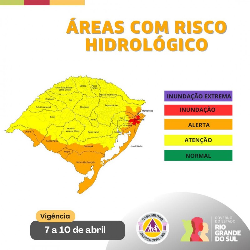 Em função dos altos acumulados previstos para região litorânea, com chuvas fortes, é indicado risco de INUNDAÇÃO em cidades do Litoral Norte e cabeceiras do rio do Sinos, que estão em vermelho no mapa hidrológico. Nesses locais podem ocorrer risco de inundações em rios e arroios e riscos já apresentado nas faixas de atenção e alerta.