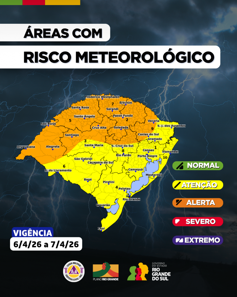 Na terça-feira (07), segue a condição para tempestades em boa parte do Estado, acompanhadas de rajadas de vento que podem superar os 90 km/h, chuva pontualmente intensa, queda de granizo, especialmente nas Missões, RMPOA, Vales, Centro, Noroeste, Norte, Serra e Litoral Norte. As tempestades vão afetar áreas das Missões e Centro na madrugada, avançando para as demais regiões do Estado ao longo do dia. Os acumulados podem ser altos em curto espaço de tempo, oscilando entre 10 e 60 mm/dia, com pontuais de até 120 mm/dia no Oeste, Missões, Noroeste e Centro. O mar segue agitado e com ressaca.