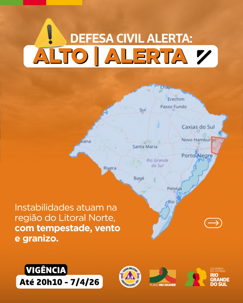 Defesa Civil alerta: Condição de ALERTA para instabilidades atuam na região do Litoral Norte, com tempestade, vento e granizo. Válido até às 20h10 do dia 7 de abril. Evite áreas de risco. Emergência ligue 190/193.
