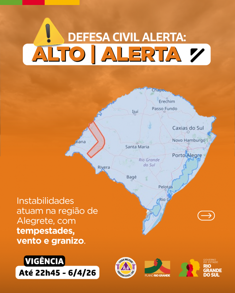 Defesa Civil alerta: condição de ALERTA para instabilidades atuando na região Alegrete, com tempestades, vento e granizo. Risco ALTO de destelhamento. Válido até 22h45 do dia 6 de abril. Evite áreas de risco. Emergência ligue 190/193.