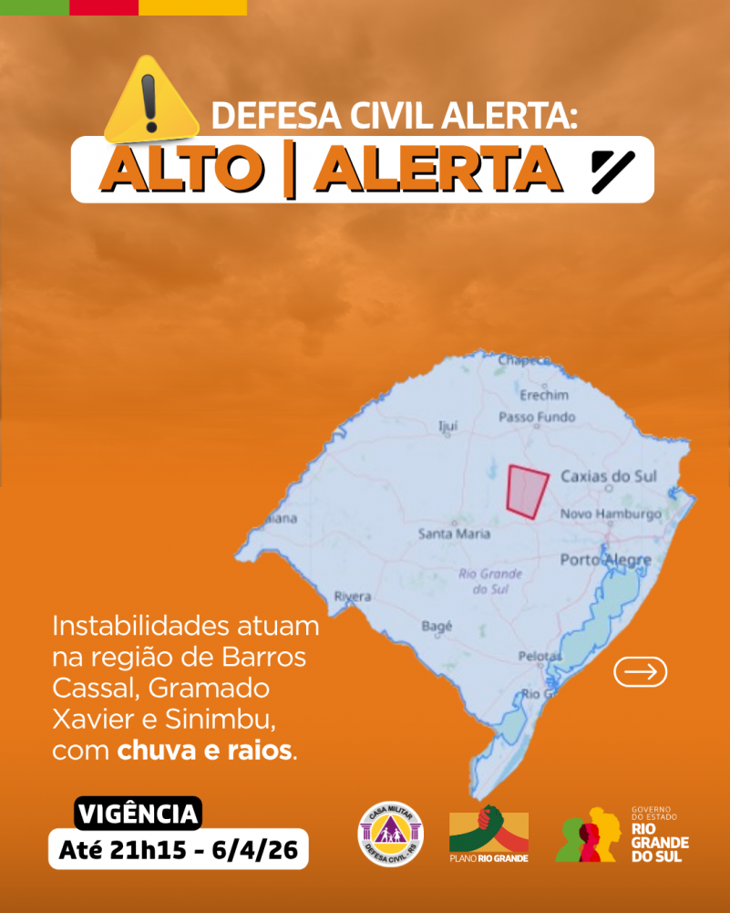 Defesa Civil alerta: condição de ALERTA para instabilidades atuando na região de Barros Cassal, Gramado Xavier e Sinimbu, com chuva e raios. Risco ALTO de alagamentos. Válido até 21h15 do dia 6 de abril. Evite áreas de risco. Emergência ligue 190/193.