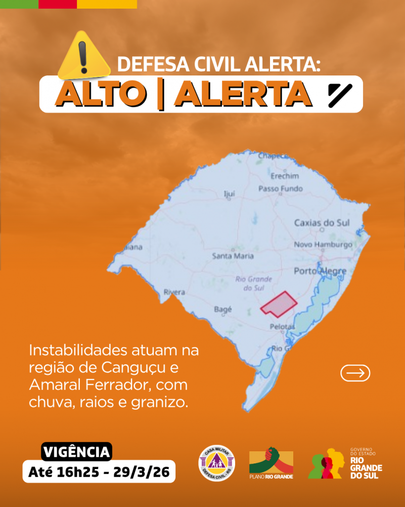 Defesa Civil alerta: condição de ALERTA para instabilidades atuando na região de Canguçu e Amaral Ferrador, com chuva, raios e granizo. Risco ALTO de destelhamento. Válido até 16h25 do dia 29 de março. Evite áreas de risco. Emergência ligue 190/193.