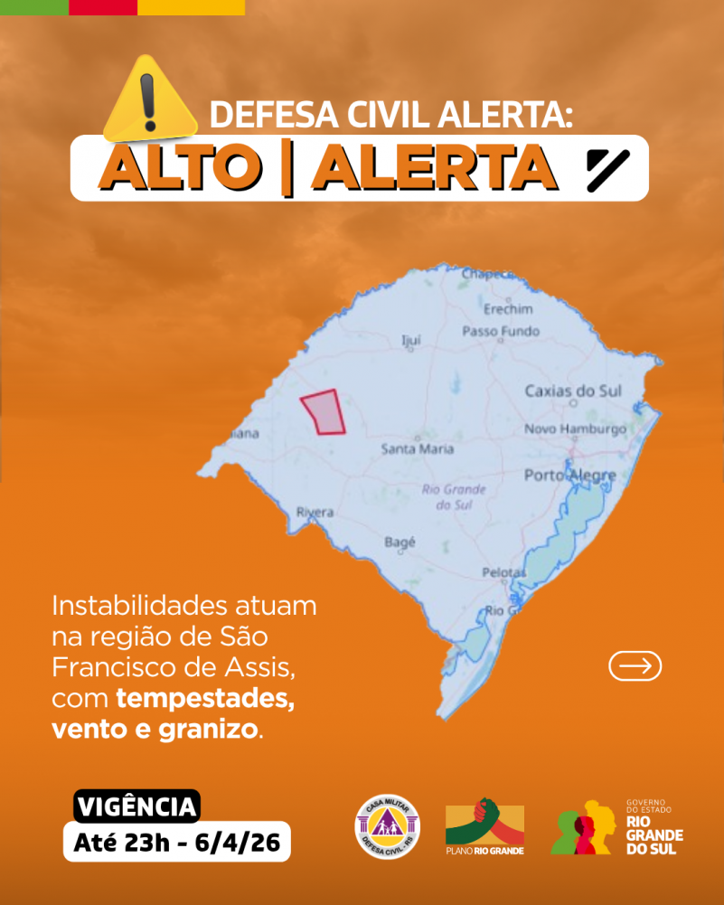 Defesa Civil alerta: condição de ALERTA para instabilidades atuando na região de São Francisco de Assis, com tempestades, vento e granizo. Risco ALTO de destelhamento. Válido até 23h do dia 6 de abril. Evite áreas de risco. Emergência ligue 190/193.