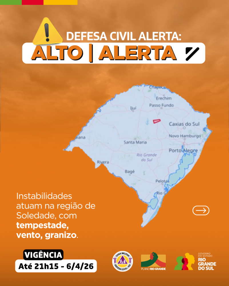 Defesa Civil alerta: condição de ALERTA para instabilidades atuando na região de Soledade, com tempestade, vento, granizo. Risco ALTO de destelhamento. Válido até 21h15 do dia 6 de abril. Evite áreas de risco. Emergência ligue 190/193.