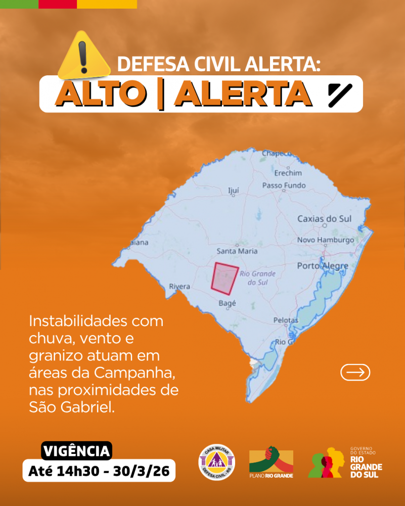 Defesa Civil alerta: condição de ALERTA para instabilidades com chuva, vento e granizo atuando em áreas da Campanha, nas proximidades de São Gabriel. Risco ALTO de destelhamento. Válido até 14h30 do dia 30 de março. Evite áreas de risco. Emergência ligue 190/193.