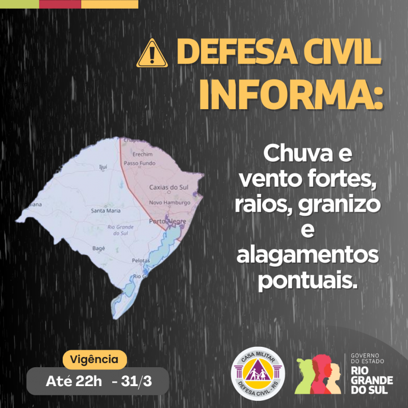 Defesa Civil informa sobre chuva e ventos fortes, raios, granizo e alagamentos pontuais atuando na região em vermelho no mapa. Válido até as 22h de segunda-feira, 31 de março. Emergência ligue 190/193.