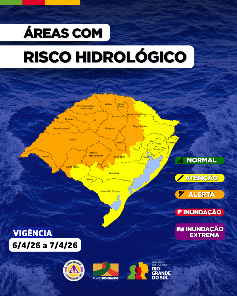 O Centro de Monitoramento da Defesa Civil atualiza o prognóstico hidrológico para os próximos dias. A condição hidrológica atual é de níveis entre limiares de normalidade e crítico para níveis baixos, com as tendências gerais de estabilidade ou declínio. Em função das chuvas previstas, com destaque para os volumes elevados no Oeste e Centro do estado, é indicada a condição de ALERTA e ATENÇÃO para as cidades em laranja e amarelo no mapa hidrológico. Neste cenário atenta-se para o risco de cheias em arroios, córregos e pequenos rios, além de alagamentos em áreas urbanas conforme a intensidade da chuva. Já os rios de maior porte devem registrar elevações moderadas, sem riscos de inundações, com recuperação dos limiares baixos.